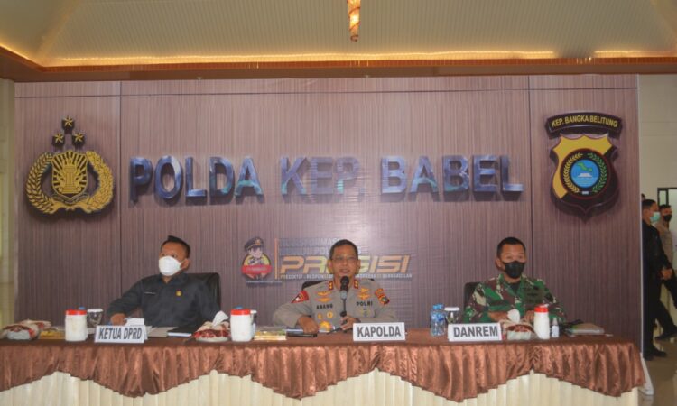 Pangkalpinang – Penrem 045/Garuda Jaya. Danrem 045/Garuda Jaya Brigjen TNI M Jangkung Widyanto, S.I.P., M.Tr.(Han) dan Kapolda Kep Babel Irjen Pol Drs. Anang Syarif Hidayat bersama Forkopimda Provinsi Kepulauan Babel menggelar Rapat Koordinasi Penanganan Covid-19 di wilayah Bangka Belitung Rabu 02/06/2021 di Gedung Tri Brata Polda Babel.