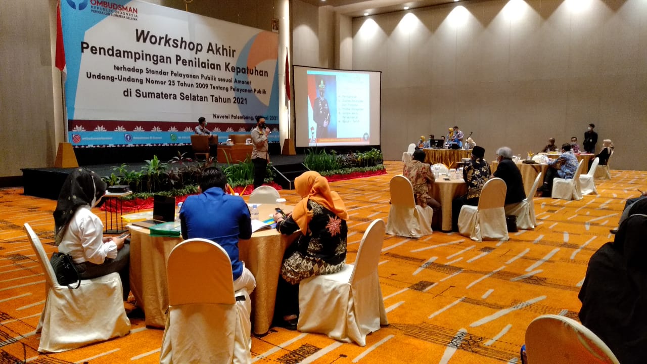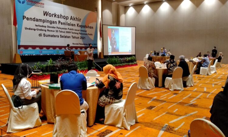 Posberitanasional.com, 3/06/2021, PALEMBANG – Workshop akhir pendampingan penilaian kepatuhan terhadap standar pelayanan publik sesuai amanat undang-undang nomor 25 tahun 2009 tentang pelayanan publik di Sumatera Selatan tahun 2021, Ombudsman RI Perwakilan Sumsel hadir memberikan materi serta mengapresiasi Polres Muara Enim yang dianggap telah berhasil menjalankan Standar Pelayanan Publik (SPP), Peserta Worshop dihadiri perwakilan Provinsi dan Pemerintah Kabupaten/Kota di Sumatera Selatan. Giat berlangsung di Hotel Novotel, Kamis 03 Juni 2021.