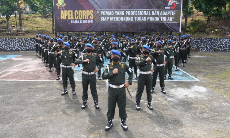 Manokwari – Polisi Militer Kodam (Pomdam) XVIII/Kasuari, menggelar apel Corps Hari Ulang Tahun (HUT) ke-75 Polisi Militer Angkatan Darat (Pomad) dipimpin Komandan Polisi Militer Kodam (Danpomdam) XVIII/Kasuari, Kolonel Cpm Irsyad Hamdie Bey Anwar diikuti seluruh Prajurit dan PNS Pomdam XVIII/Kasuari beserta Persit Cabang Pomdam XVIII/Kasuari di Lapangan Voly Kantor Exsubdenpom, Manokwari, Papua Barat, Selasa (22/6/2021).