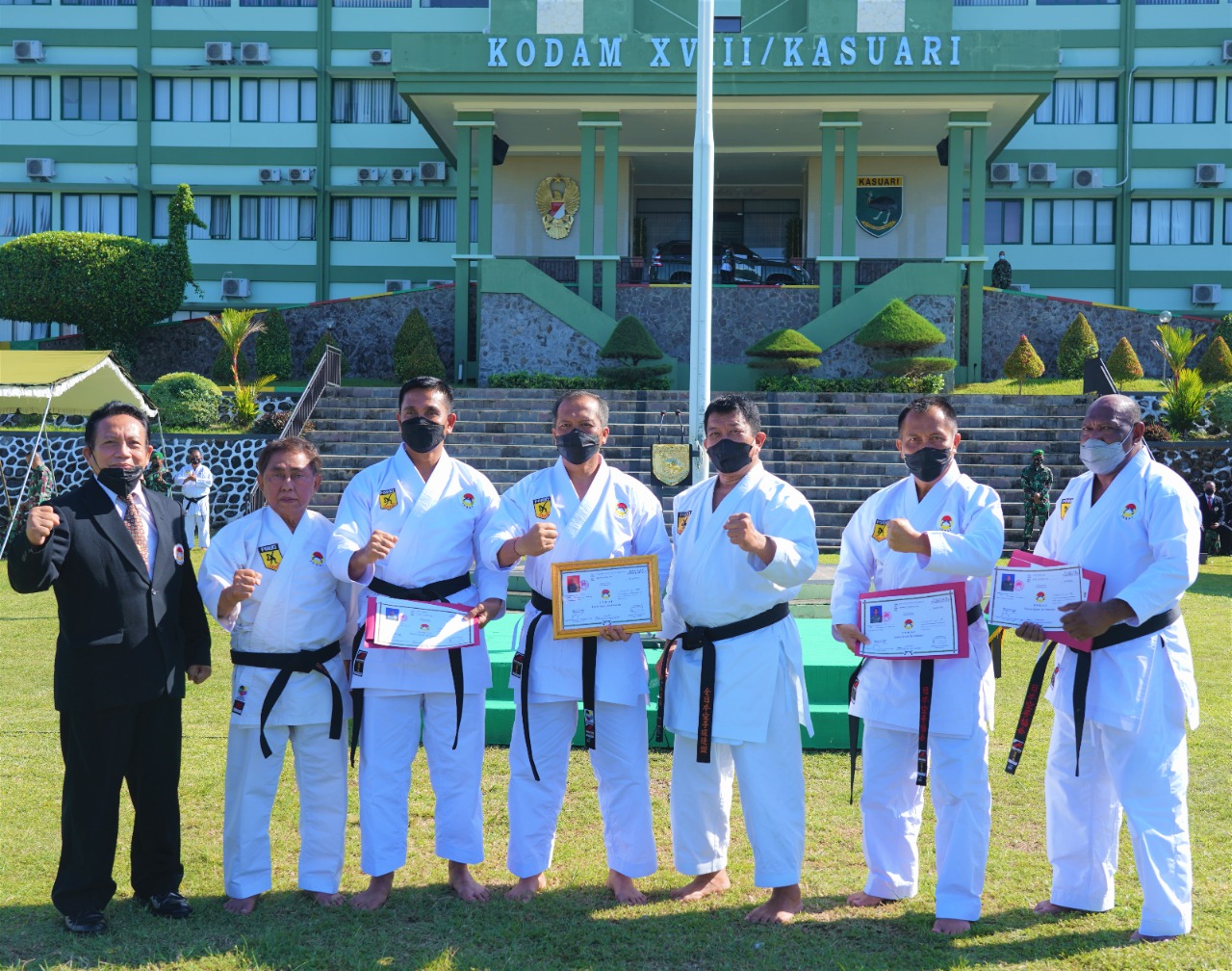 Manokwari – Kodam XVIII/Kasuari, menggelar acara pelantikan pengurus affiliasi pusat Institut Karate-Do Indonesia (INKAI) Kodam XVIII/Kasuari serta penyematan Dan kehormatan, di Lapangan Upacara Makodam XVIII/Kasuari, Trikora, Arfai 1 Manokwari, Papua Barat dihadiri Pangdam XVIII/Kasuari I Nyoman Cantiasa, S.E., M.Tr.(Han) dan Wakil Ketua Umum 3 PP INKAI, Machrup Elric, S.H., MBA., sebagai pimpinan upacara, Jumat (25/6/2021).