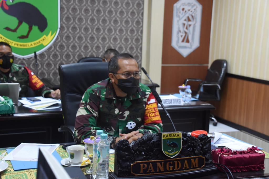 Manokwari – Pangdam XVIII/Kasuari Mayjen TNI I Nyoman Cantiasa, S.E.M.Tr.(Han)., didampingi Asops dan Kakesdam XVIII/Kasuari mengikuti rapat virtual dengan Mabes TNI yang dipimpin langsung oleh Panglima TNI Marsekal TNI Dr. (H.C) Hadi Tjahjanto, S.I.P. dengan agenda serbuan vaksinasi dari ruang Pusat Komando Pengendalian Operasi (Puskodalops) Kodam XVIII/Kasuari, Arfai1, Manokwari, Papua Barat, Jumat (2/7/2021).