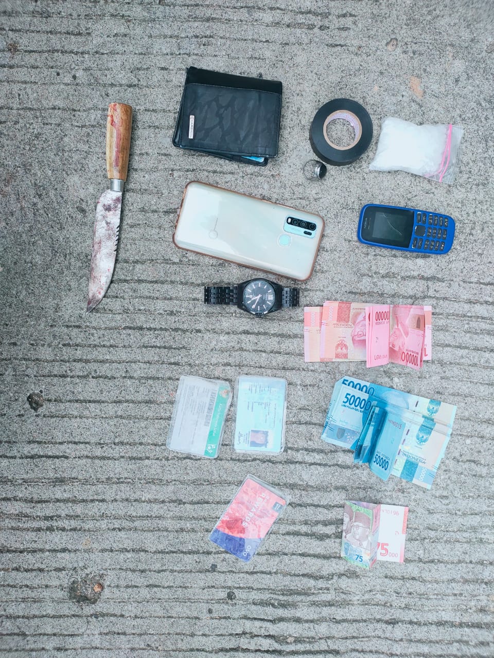 Adapun Barang Bukti yang diduga Narkotika jenis sabu yang diamankan dari terduga pelaku dengan Berat Bruto 51,33 gram dan sajam bergagang kayu dengan ukuran lebih kurang 50 cm, satu buah dompet kulit warna Hitam yang berisi Identitas, satu buah jam tangan Besi warna Hitam, satu ponsel merek Nokia warna Biru, satu buah ponsel merek vivo warna biru Laut, uang pecahan Rp 100 ribu sebnyak enam lembar, uang pecahan Rp 50 ribu sebanyak sembilan lembar, uang pecahan Rp 75.000 sebanyak satu lembar dan satu buah cincin.