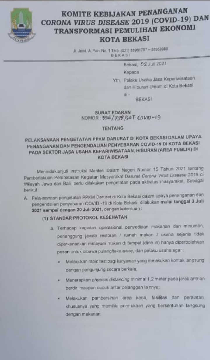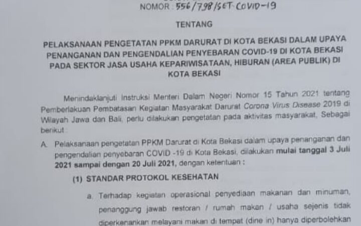 A. Pelaksanaan pengetatan PPKM Darurat di Kota Bekasi dalam upaya penanganan dan pengendalian penyebaran Covid-19 di Kota Bekasi, dilakukan *mulai tanggal 3 Juli sampai dengan 20 Juli 2021*, dengan ketentuan:
