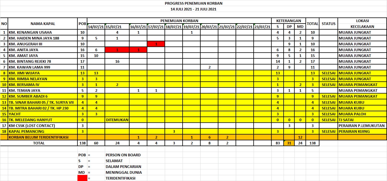 Hingga kini Tim SAR Gabungan terus melakukan pencarian dan pertolongan, total korban berjumlah 138 orang (Korban Selamat 83 orang, Korban Meninggal Dunia 24 orang dan 31 orang dalam pencarian),” ungkapnya.