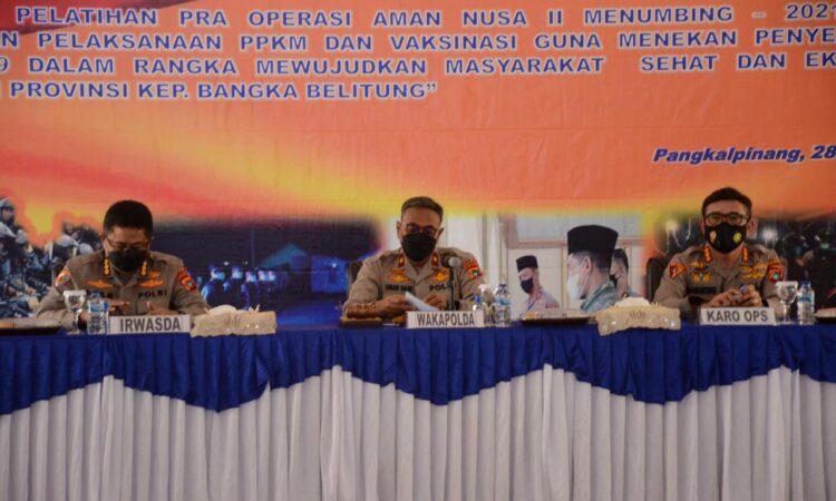 BABEL – Wakapolda Kep. Bangka Belitung Brigadir Jenderal Polisi Drs. Umardani, M.Si didampingi Irwasda dan Karo Ops Polda Kep. Bangka Belitung memimpin Pelatihan Pra Operasi Aman Nusa II Menumbing 2021 yang digelar di Gedung Tribrata Polda Kep. Bangka Belitung, Rabu (28/7/21).