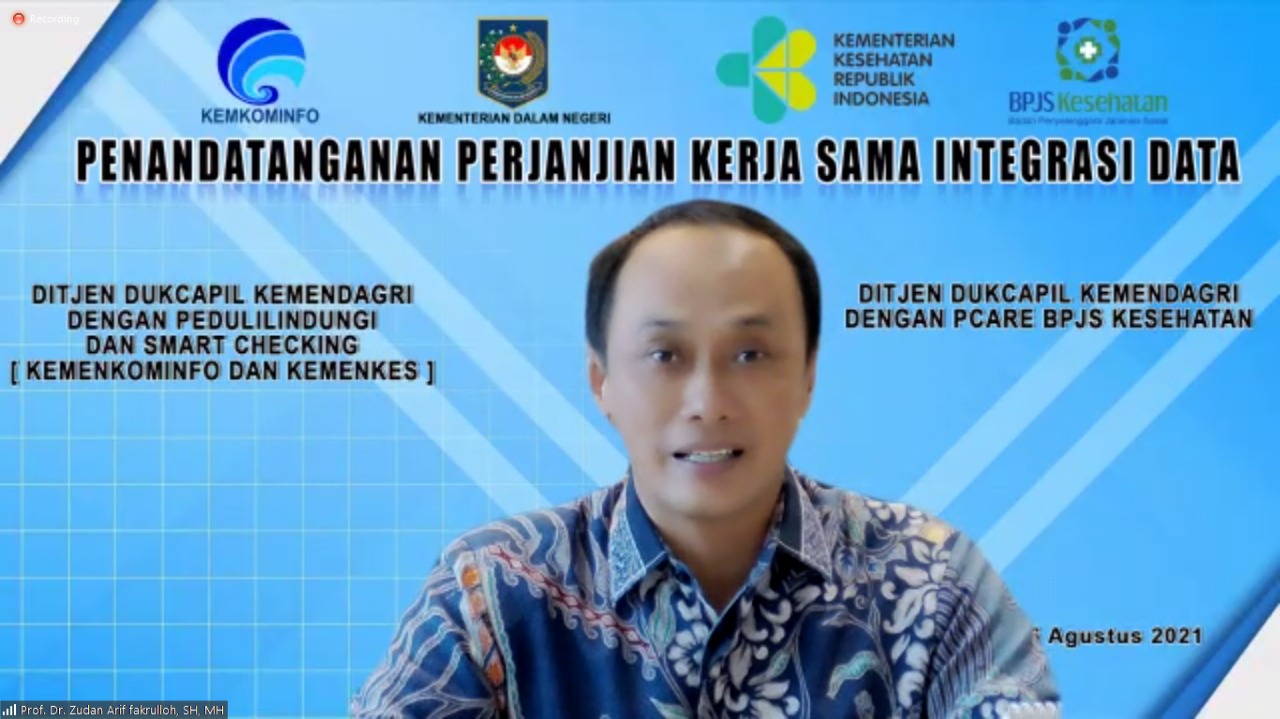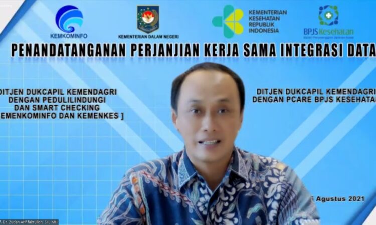 Jakarta – Direktorat Jenderal (Ditjen) Kependudukan dan Pencatatan Sipil (Dukcapil) Kementerian Dalam Negeri (Kemendagri) menjalin kerja sama dengan Kementerian Kesehatan (Kemenkes), Kementerian Komunikasi dan Informatika (Kemenkominfo) dan Badan Penyelenggara Jaminan Sosial (BPJS) Kesehatan untuk mengintegrasikan data kependudukan sebagai upaya mempercepat program vaksinasi. Kerja sama itu resmi dimulai, ditandai dengan penandatangan secara virtual oleh Dirjen Dukcapil Zudan Arif Fakrulloh, Sekretaris Jenderal Kemenkes Oscar Primadi, Plt. Dirjen Penyelenggara Pos dan Informatika Kemenkominfo Ismail, serta Direktur Utama BPJS Kesehatan Ali Ghufron Mukti, Jumat (6/8/2021).