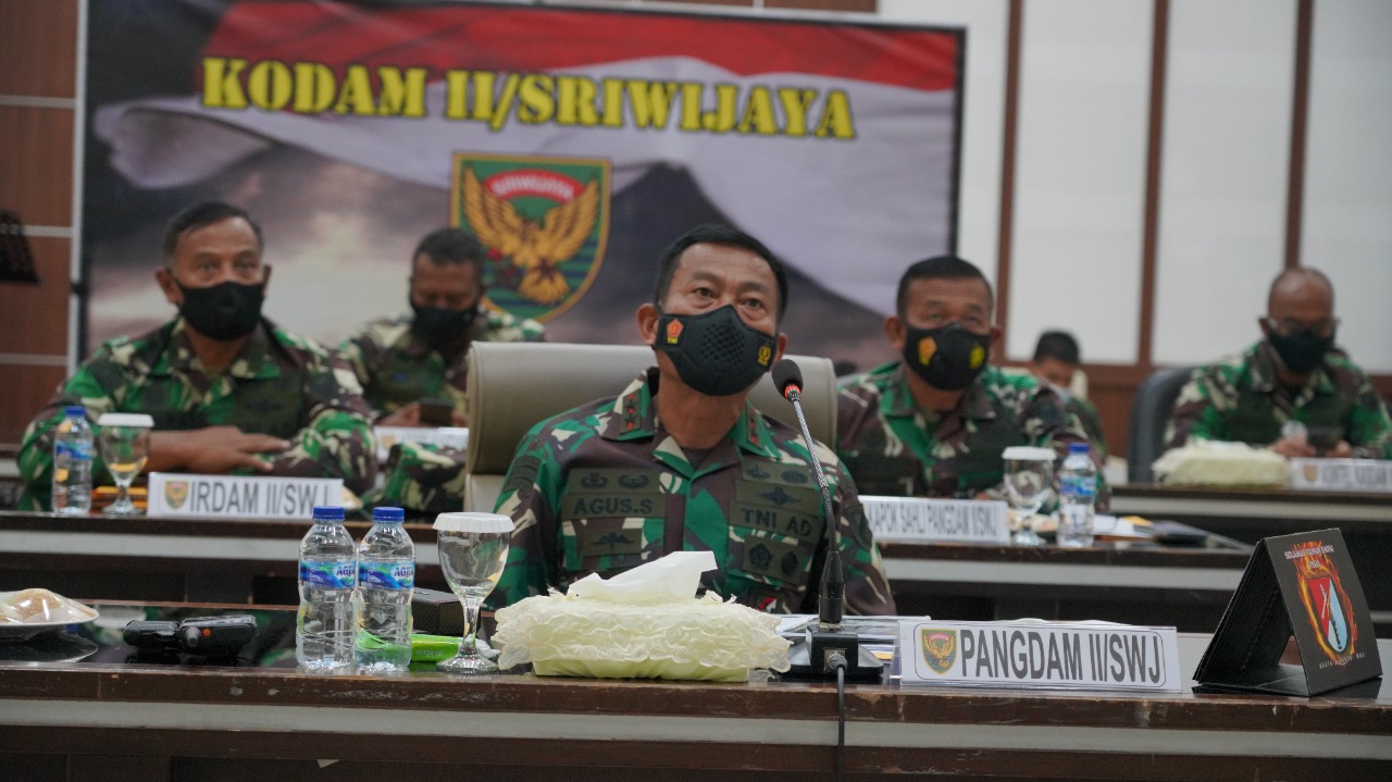Palembang – Pangdam II/Sriwijaya Mayjen TNI Agus Suhardi mengikuti Video Conference (Vicon) Mobile Training Team (MTT) Security Force Assistance Brigade (SFAB) Gelombang – III antara TNI AD dengan AD Amerika Serikat (US Army) TA 2021, bertempat di Ruang Gatot Subroto (Gatsu) Makodam II/Swj Jln. Jenderal Sudirman KM. 2,5 Palembang, Sabtu (7/8/2021).