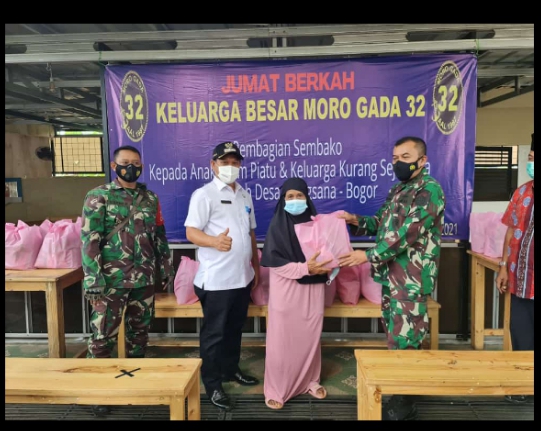 Sebanyak 200 kilo gram beras dan 32 paket sembako, dibagikan kepada yatim piatu dan warga di tengah pandemi Covid-19. Bantuan ini berasal dari Keluarga Besar Moro Gada 32, bertempat di Pondok Pesantren Yatim Piatu Daarul Musthofa dan warung rindang 87 Desa Ciangsana kecamatan Gunung Putri, Jumat (13/08/21).