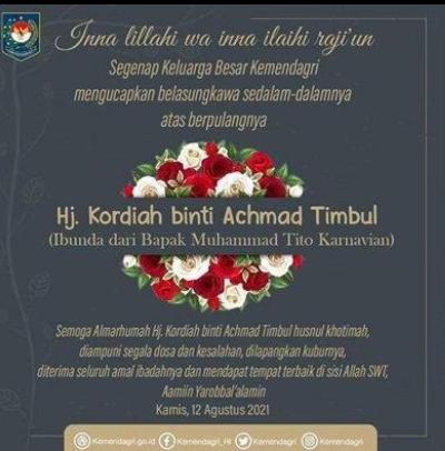 Jakarta, Ibunda dari Menteri Dalam Negeri (Mendagri) Jenderal Polisi Purnawirawan Tito Karnavian, yakni Hj Kordiah binti Achmad Timbul, dikabarkan tutup usia pada Kamis (12/8/2021) malam.