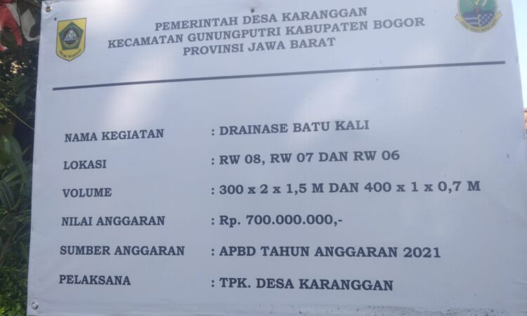 Untuk diketahui, pada papan proyek yang tertera , pembangunan drainase batu kali terbenntang di RW 06 , 07 dan RW 08. Dengan volume pekerjaan drainase, Panjang 300 meter x Lebar 2, x 1,5 dan Tinggi 400 x 1 x 0,7 meter pada tahap 1 hingga tahap 2, dengan anggaran Rp.700 Juta. Sumber anggaran APBD 2021, dan untuk pelaksana tercantum TPK Desa Karanggan tanpa tercantum masyarakat.