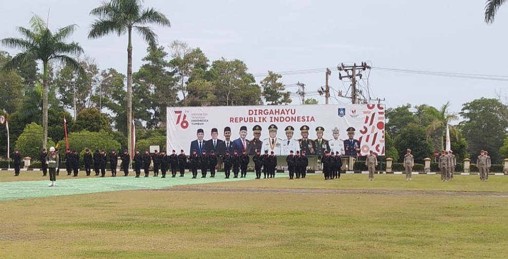 Pangkalpinang – Danrem 045/Garuda Jaya Brigjen TNI M Jangkung Widyanto, S.I.P., M.Tr.(Han) bersama dengan prajurit mengikuti upacara memperingati HUT RI ke-76 di Kantor Gubernur Provinsi Kepulauan Babel Selasa 17/08/2021.