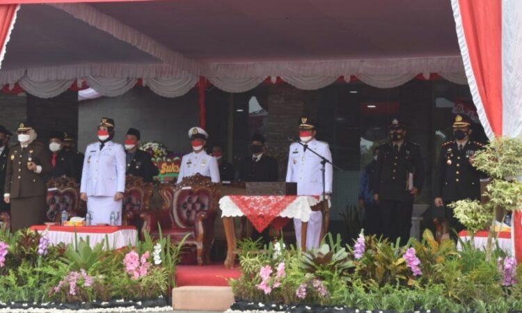 BANGKA SELATAN – H. Riza Herdavid, S.T,. M.Tr.Ip., bertindak sebagai Inspektur upacara sekaligus membaca teks Pancasila dalam acara upacara peringatan hari ulang tahun (HUT) RI ke – 76 Kemerdekaan Republik Indonesia (RI), giat berlangsung di halaman komplek perkantoran terpadu pemerintah kabupaten Bangka Selatan, Selasa (17/08/21).