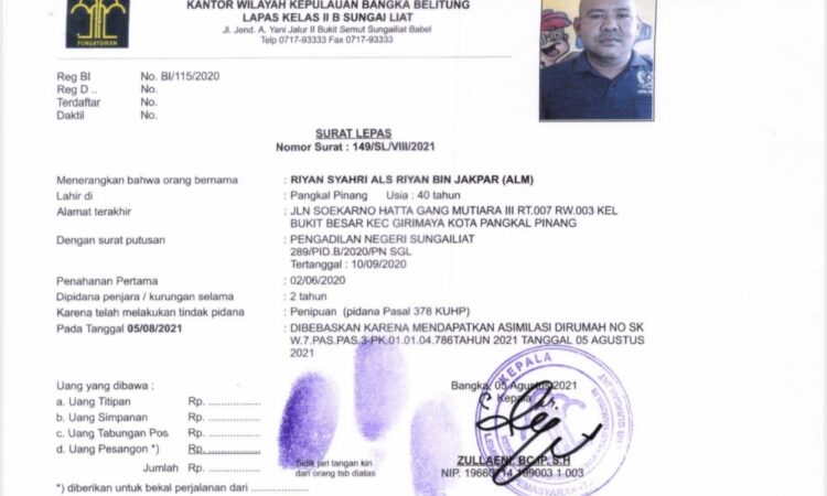 “Terkait Napi RS sudah dikeluarkan dari lapas Bukit Semut, berdasarkan surat lepas nomor 149/SL/VIII/2021 tertanggal 5 Agustus 2021, dibebaskan karena mendapatkan asimilasi dirumah Nomor SK W.7.PAS.PAS.3-PK.01. 01.04. 786 tahun 2021 tanggal 5 Agustus 2021,” jelasnya.