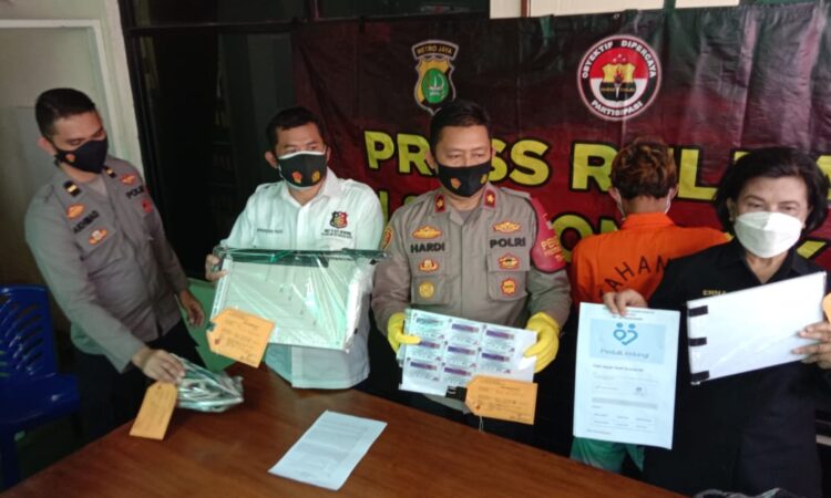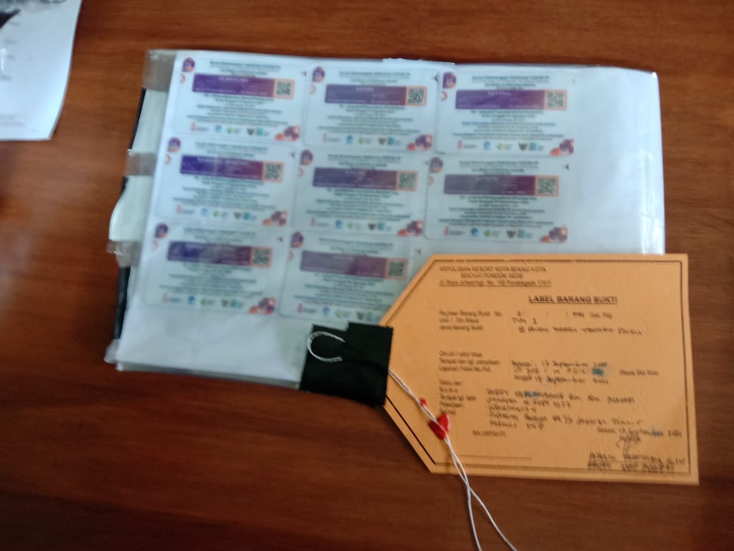 Polsek Pondok Gede mendapatkan laporan informasi dari masyarakat terkait adanya penjualan kartu Vaksin Palsu Covid-19 yang dilakukan oleh tersangka berinisial DH dengan barang bukti berupa 8 lembar kartu vaksin palsu,15 lembar kertas pvc,2 laptop,printer,alat pemotong kertas dan setrika.