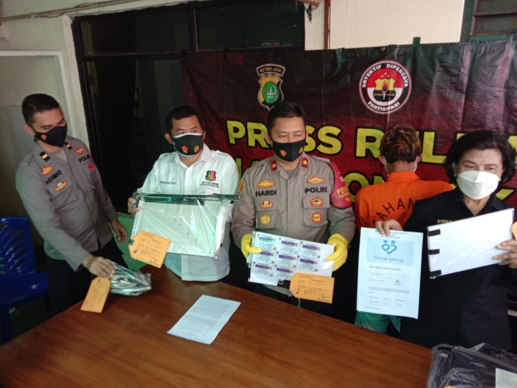 Atas kejadian tersebut Team Reskrim Polsek Pondok Gede langsung melakukan penangkapan serta mengamankan DH berikut barang bukti kartu vaksin palsu, kertas PVC, laptop, printer, alat pemotong kertas, dan setrika.