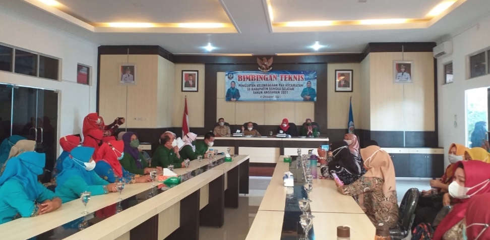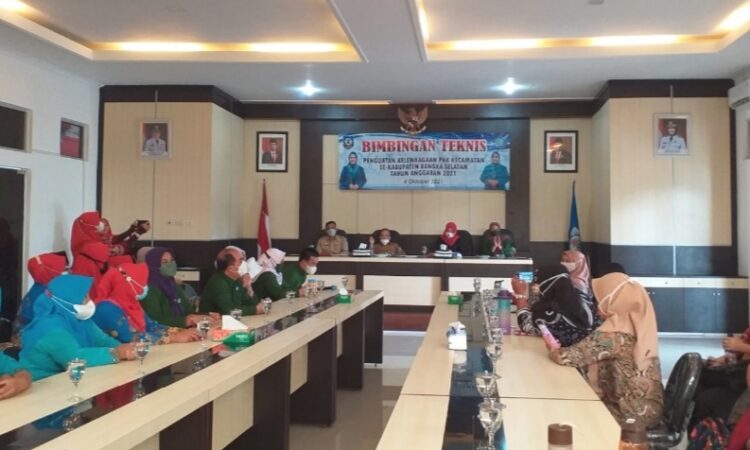 BASEL – PKK Kecamatan se-Kabupaten Bangka Selatan Tahun Anggaran 2021, menggelar bimtek di ruang rapat gunung namak sekretariat Daerah Kabupaten Bangka Selatan, yang diikuti 80 orang terdiri dari 8 Kecamatan, 3 Kelurahan, dan 3 Desa (yang mewakili HKG tahun sebelumnya. Senin (04/10/21).