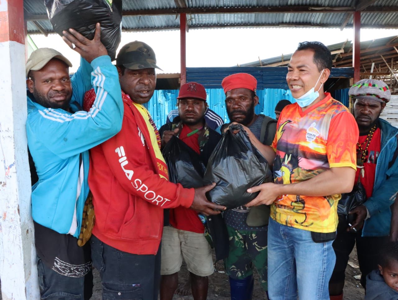 Deiyai, Kasat Intel Polres Deiyai Polda Papua Iptu Harsat Muthalib, SH.MH mewakili Kapolres Deiyai AKBP Herzoni Saragih, S.I.K,MH memberikan Sembako pada pemuda asli papua di Lapangan Thomas Adi, Jumat pagi (3/12/21).
