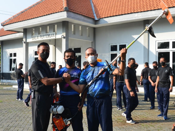 Surabaya – Untuk memompa semangat jiwa korsa warga Komplek Perumahan Dinas Dewaruci resik dan sehat, Gubernur Akademi Angkatan Laut (AAL), Mayjen TNI (Mar) Nur Alamsyah memberikan dukungan empat unit mesin potong rumput, puluhan sabit, golok, sapu lidi dan alat kebersihan lainnya kepada warga Rumah Dinas AAL, Komplek Dewaruci, Pesapen, Surabaya, Kamis (6/1).