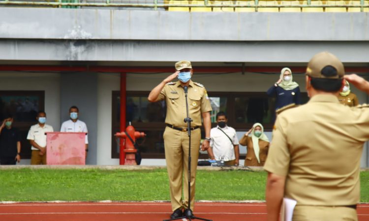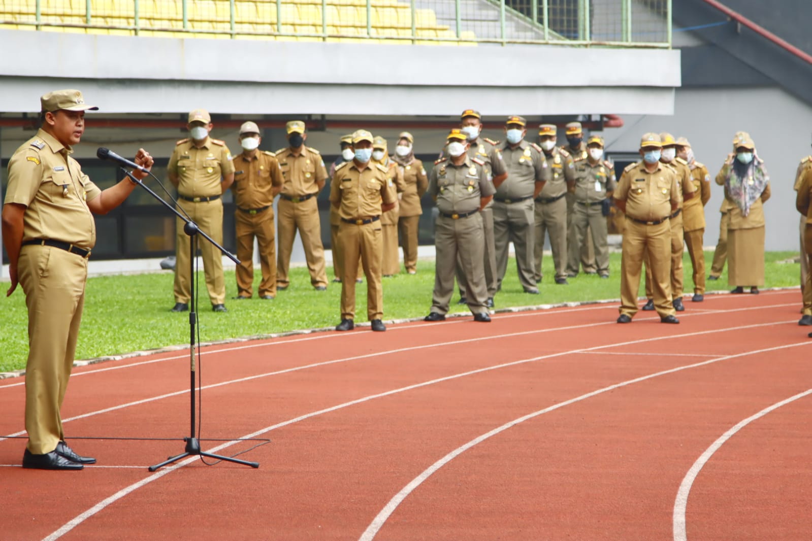 KOTA BEKASI – Senin, 10 Januari 2022,Tri Adhianto memimpin apel perdana sebagai Pelaksana Tugas (Plt) Wali Kota Bekasi di Stadion Patriot Chandrabaga, Senin (10/1/2022).