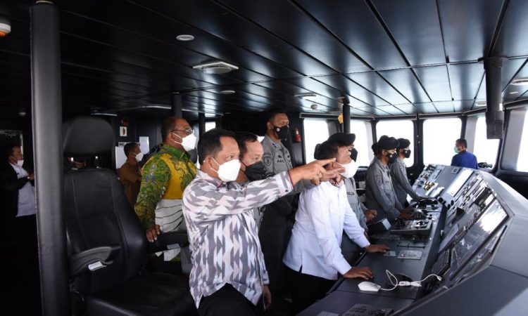 BATAM – Kepala Bakamla RI Laksdya TNI Dr. Aan Kurnia bersama Menteri Dalam Negeri Tito Karnavian, Wakil Menteri Pertahanan Letjen TNI M. Herindra dan Gubernur Kepulauan Riau Ansar Ahmad dengan menggunakan unsur kapal patroli KN Pulau Nipah-321 meninjau Karang Singa di perairan utara Pulau Bintan, Provinsi Kepulauan Riau, Batam, Kamis (13/1/2022).