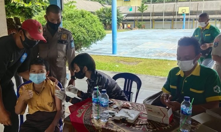 BABEL – Pangkalan TNI AL Bangka Belitung melalui Balai Kesehatan bekerja sama dengan Dinas Kesehatan Kab.Bangka kembali melaksanakan serbuan Vaksinasi dosis pertama dan kedua kepada anak usia 6 – 12 Tahun di SDN 21 Belinyu dan SD Santa Agnes Belinyu, Babel, Sabtu(22/01/2022).