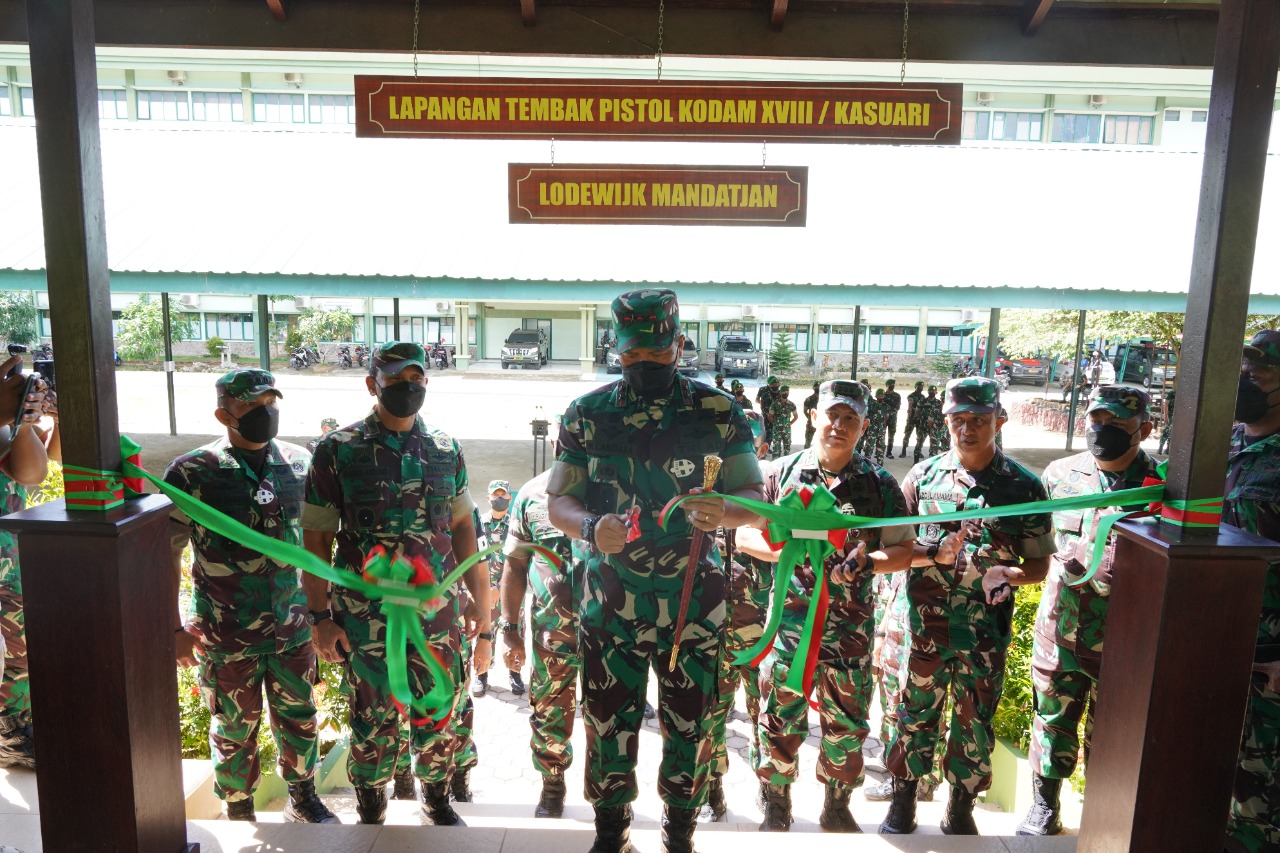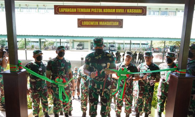 Manokwari – Dipenghujung masa jabatannya sebagai Pangdam XVIII/Kasuari, Mayjen TNI I Nyoman Cantiasa, S.E., M.Tr.(Han)., meresmikan fasilitas latihan bagi prajurit Kodam salah satunya lapangan tembak pistol Lodewijk Mandatjan, di Makodam, Trikora, Arfai 1, Manokwari, Papua Barat, Sabtu (29/1/2022).
