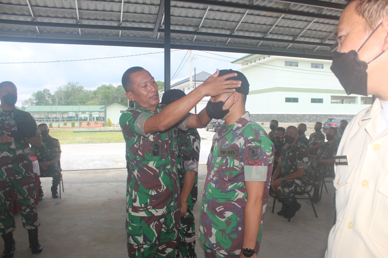 Diakhir makan bersama Brigjen TNI M Jangkung memberikan kenang-kenangan topi kebanggan seragam untuk seluruh prajurit dan PNS Korem 045/Gaya.