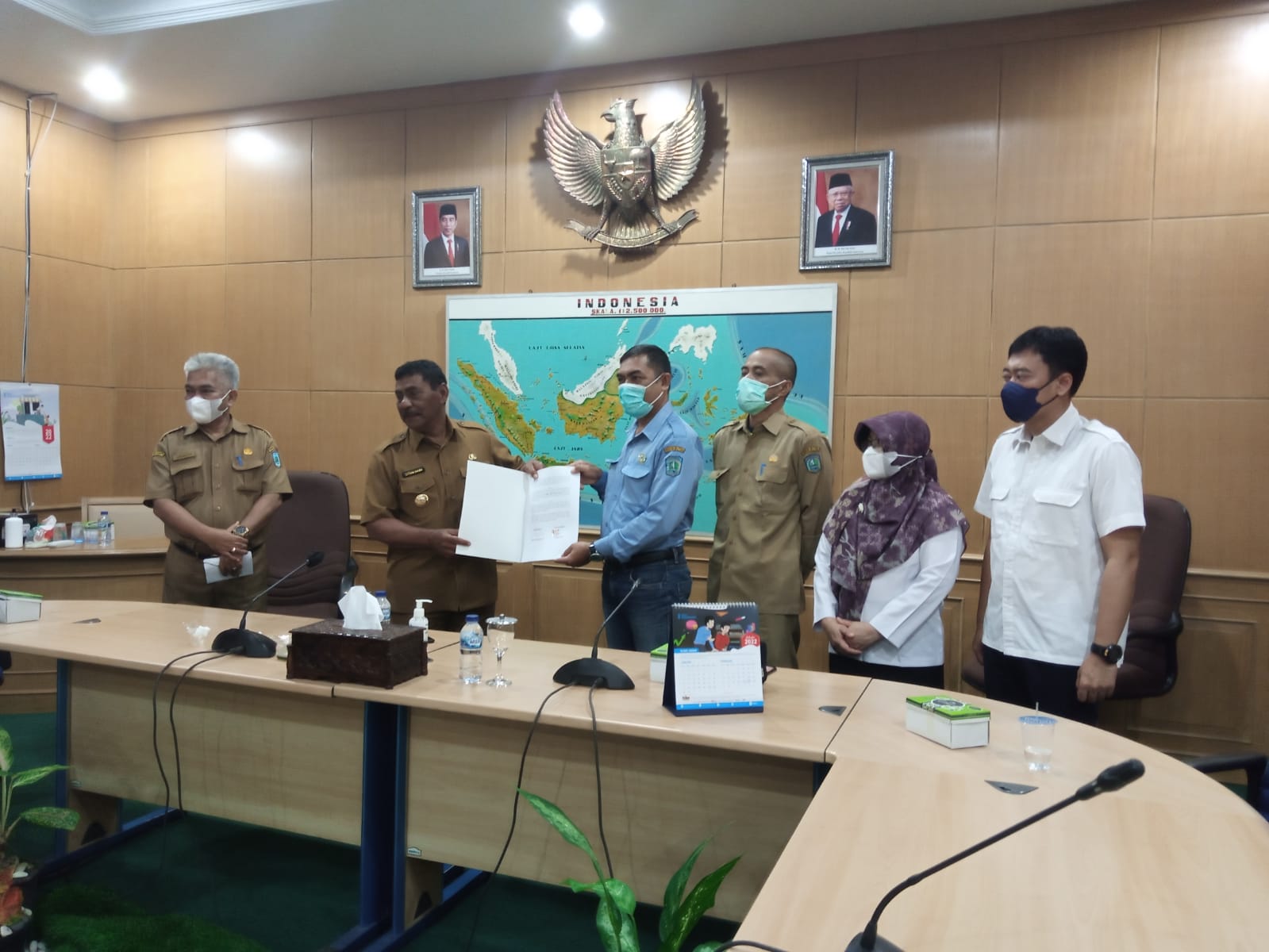 Sahani Saleh (Sanem) selaku Bupati Belitung menerima serah terima pengelolaan sementara pengerjaan pembangunan Sistem Penyediaan Air Minum (SPAM) Gunung Mentas (Batu Mentas), Senin (21/3/2022).