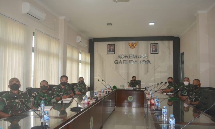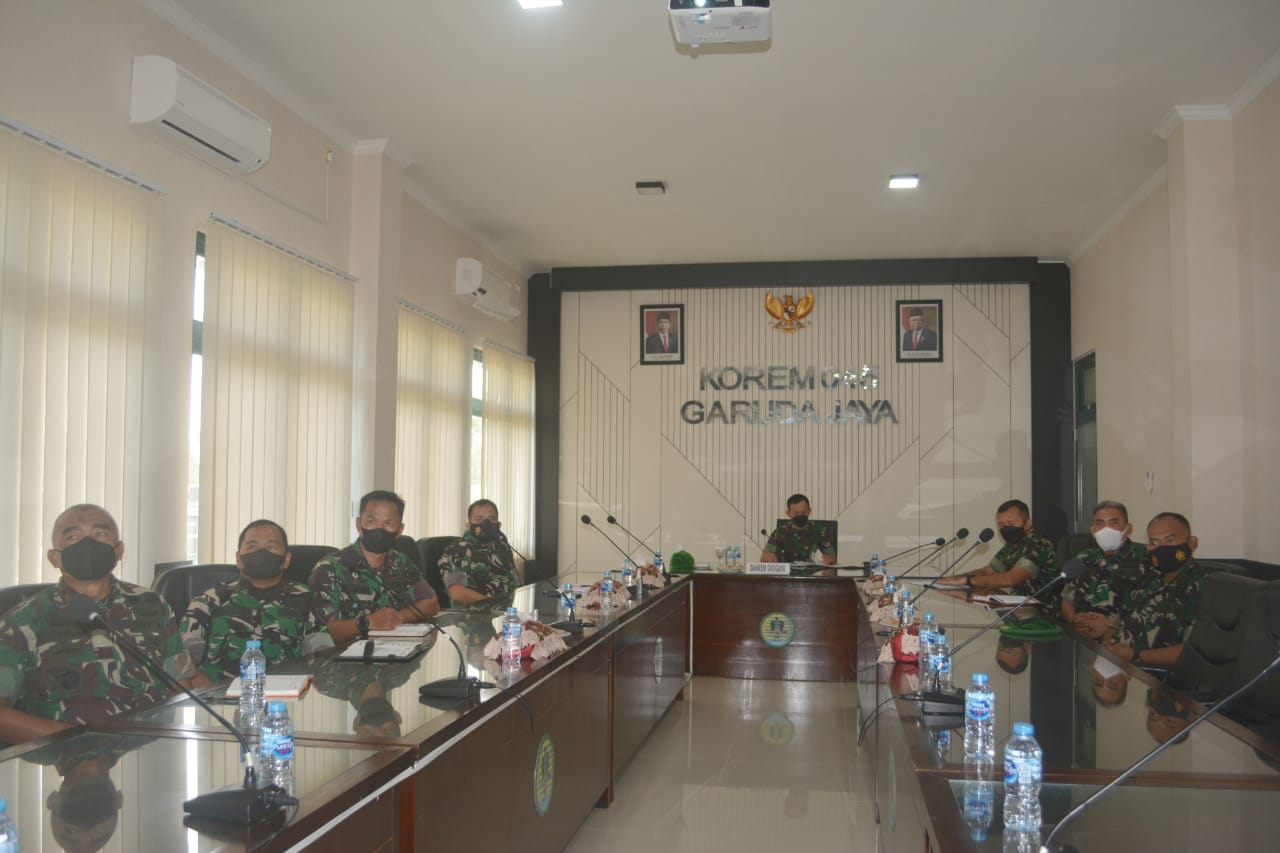 Danrem 045/Garuda Jaya Kolonel Inf Ujang Darwis MDA mengikuti kegiatan tersebut melalui Virtual bersama para Kasi dan komandan Satuan jajaran Korem dari satuan masing-masing.