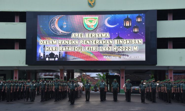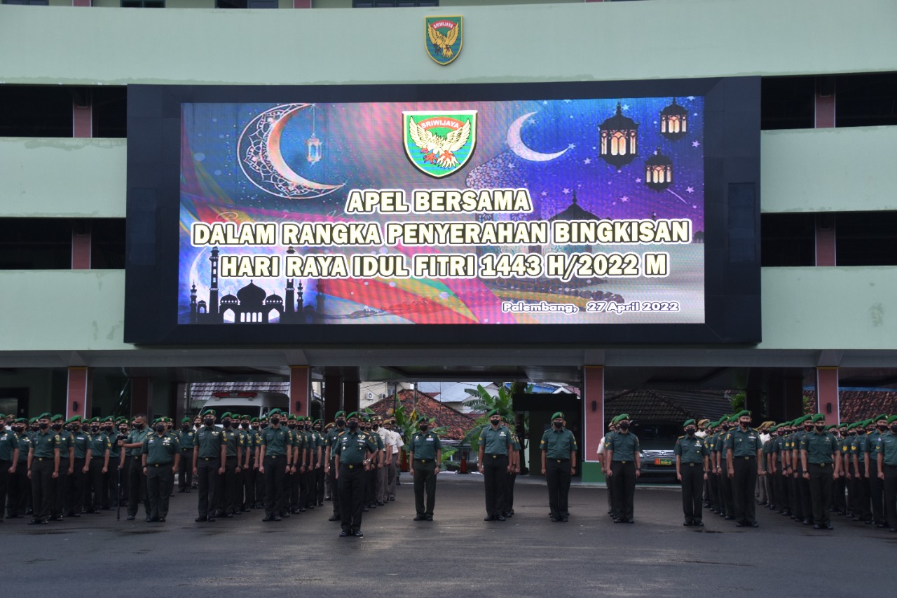 Palembang – Pangdam II/Swj Mayjen TNI Agus Suhardi, penyerahan bingkisan lebaran kepada Prajurit dan PNS di lingkungan Makodam II/Swj pada Apel Bersama, Rabu (27/4/2022) bertempat di lapangan apel Makodam II/Swj KM. 2,5 Palembang.