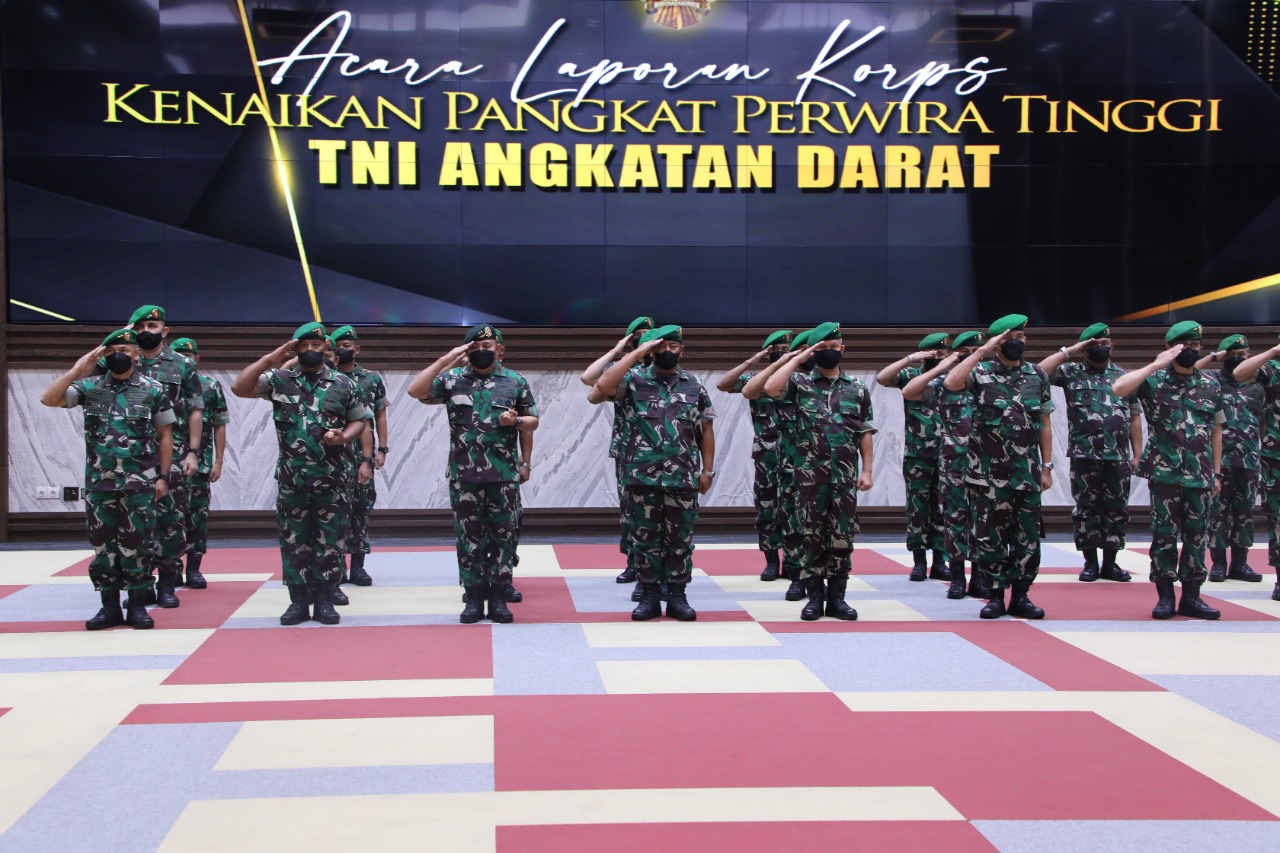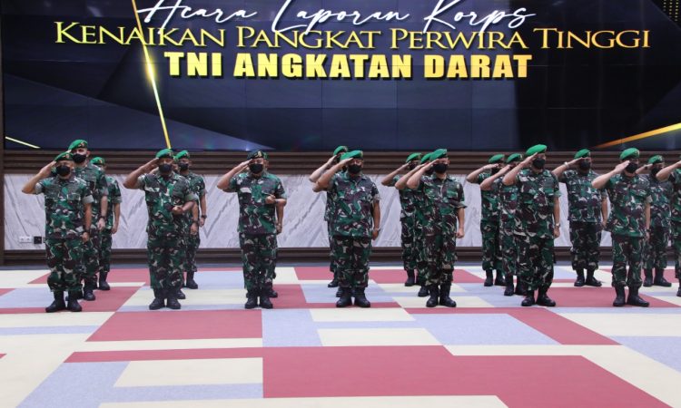 Jakarta – Sebanyak 24 Perwira Tinggi (Pati) Angkatan Darat, dinaikkan pangkat satu tingkat lebih tinggi dari pangkat semula dalam Acara Laporan Korps Kenaikan Pangkat Perwira Tinggi (KP Pati) TNI AD yang dipimpin Kepala Staf Angkatan Darat (Kasad) Jenderal TNI Dudung Abdurachman, S.E., M.M., di Markas Besar Angkatan Darat, Senin (30/5/2022).