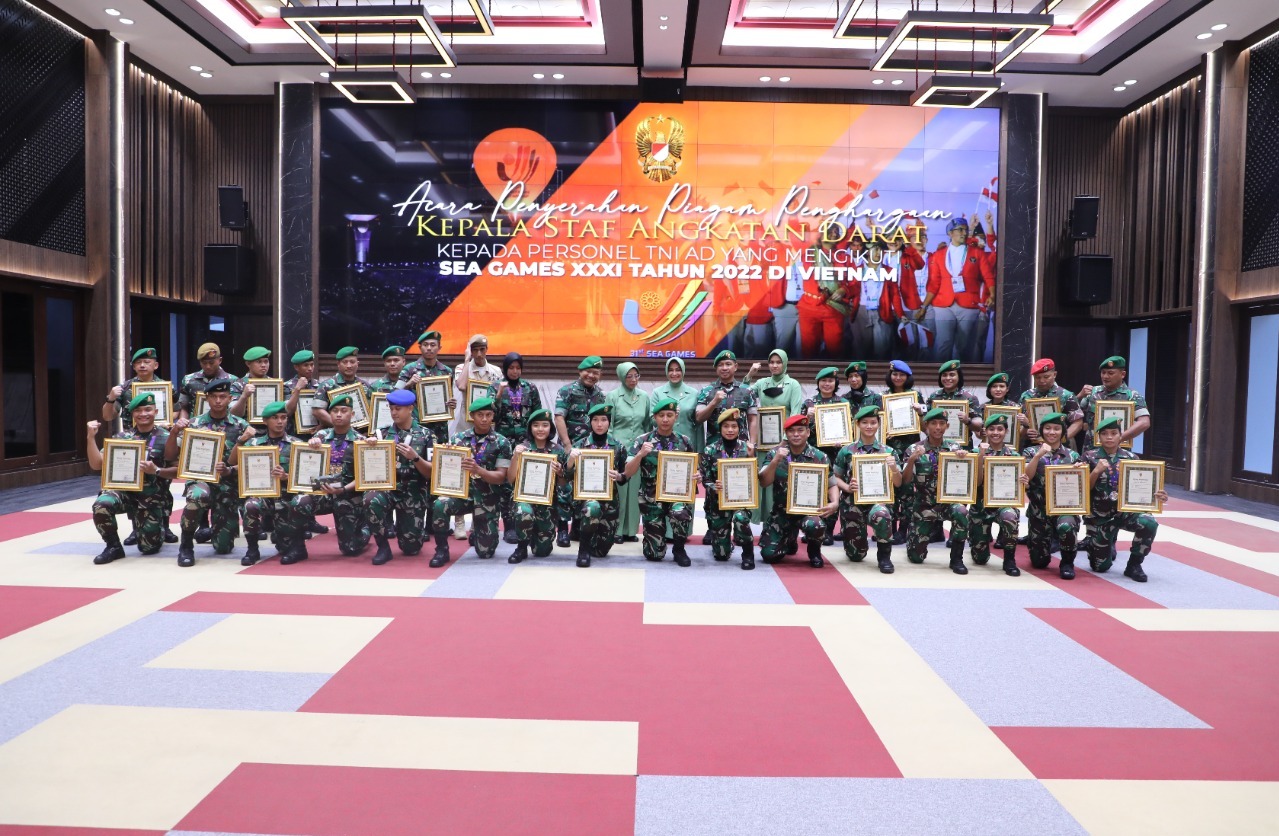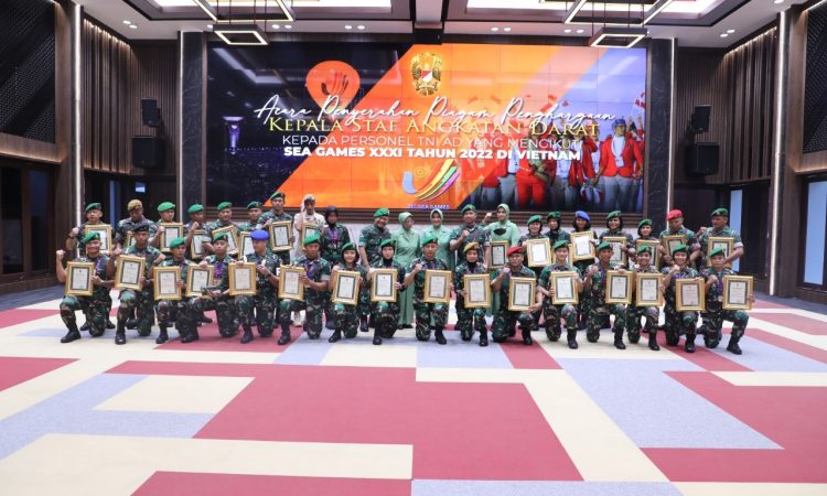 JAKARTA – Kepala Staf Angkatan Darat (Kasad) Jenderal TNI Dudung Abdurachman, S.E., M.M., memberikan penghargaan kepada 34 personel TNI AD yang turut berjuang mengharumkan nama bangsa diajang olahraga SEA Games ke-31 di Hanoi Vietnam. Acara penyerahan penghargaan dilaksanakan di Aula Djati Koesomo Mabesad Jakarta, Senin (30/5/2022).