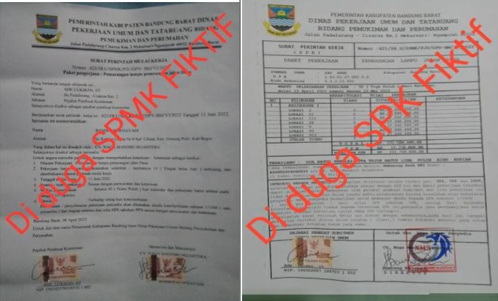 Setelah dengan dasar diduga SPK Fiktif alias bodong tersebut di croschek di Dinas Pekerjaan Umum dan Tata Ruang Bidang Pemukiman Dan Perumahan Kabupaten Bandung Barat, dari informasi yang yang dihimpun di dapat , diduga kuat RA telah berani menerbitkan atau mencetak SPK Paket Pekerjaan Pemasangan Lampu Jalan Desa yang fiktif / alias Bodong karena dari Kop surat sudah salah, tidak ada stempel,serta mengatas namakan seseorang di dinas perizinan,memalsukan tanda tangan,dan nomor NIP tidak karuan. Menurut keterangan staf di Sekretariatan Dinas Pekerjaan Umum dan Tata Ruang Bidang Pemukiman Dan Perumahan Kabupaten Bandung Barat Jumat 17/06/2022.