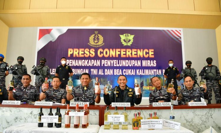 Jakarta – Tim Fleet One Quick Response (F1QR) Lantamal XII Pontianak berhasil menggagalkan penyelundupan minuman keras menggunakan 2 (dua) unit truk dan satu truk kontainer yang sedang melakukan loading miras, di Desa Darik kecamatan Karangan kabupaten Sambas, Provinsi Kalimantan Barat, Minggu, (26/6) kemarin.
