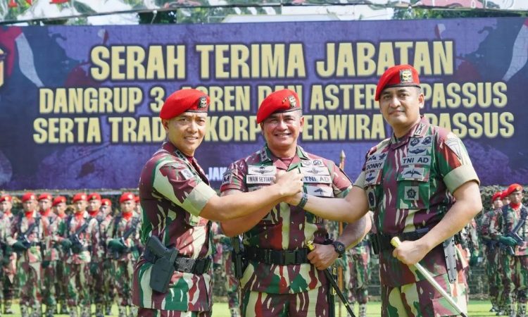 Cijantung – Danjen Kopassus Mayjen TNI Iwan Setiawan S.E., M.M., memimpin serah terima jabatan (Sertijab) sejumlah pejabat teras di Lapangan Upacara Alfred Taarega Grup-3 Kopassus Cijantung, Jakarta Timur, Selasa (19/7/2022).