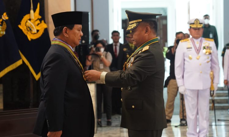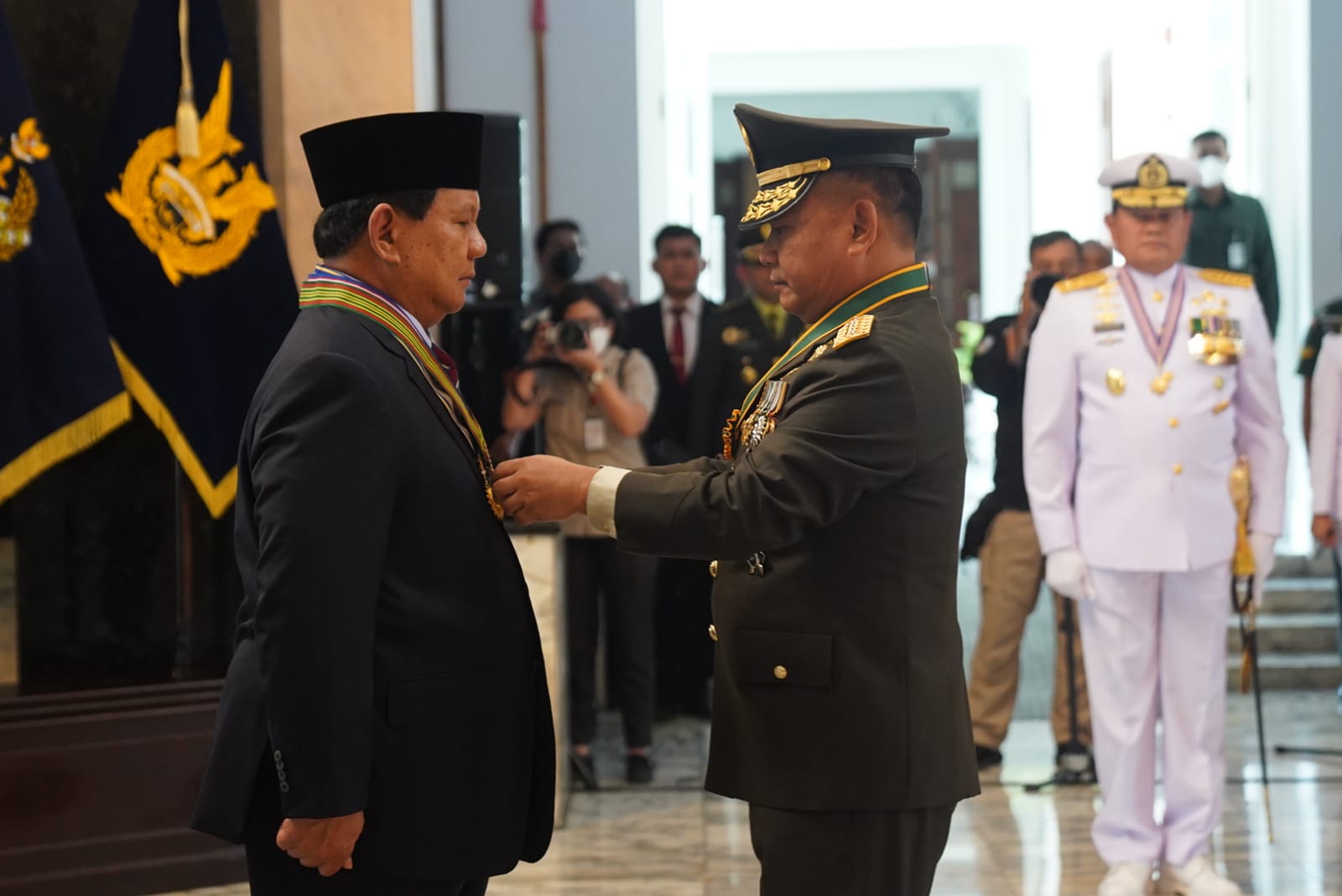 Jakarta – Kepala Staf Angkatan Darat (Kasad) Jenderal TNI Dr. Dudung Abdurachman, menyematkan Tanda Kehormatan Bintang Kartika Eka Pakci Utama kepada Menteri Pertahanan RI Letjen TNI (Purn) Prabowo Subianto, bertempat di Ruang Hening Gedung Jenderal Soedirman, Kemhan, Jakarta, Senin (15/8/2022).