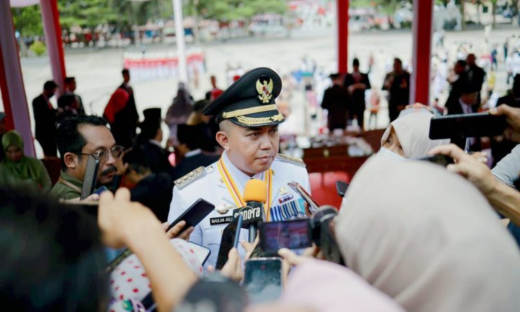 PANGKALPINANG – Wali Kota Pangkalpinang, Maulan Aklil menjadi inspektur upacara pengibaran bendera merah putih pada Peringatan Hari Ulang Tahun (HUT) ke-77 Republik Indonesia di Alun-alun Taman Merdeka, Rabu (17/8/2022).
