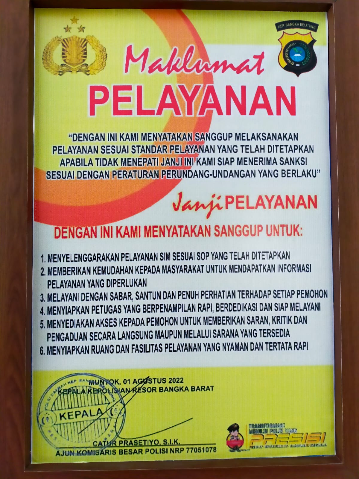 “Dalam maklumat ini bertuliskan. dengan ini kami sanggup menyelenggarakan pelayanan sesuai dengan pelayanan yang telah kami tetapkan dan apabila dalam penyelenggaraan pelayanan tidak sesuai dengan standar pelayanan yang telah kami tetapkan kami bersedia menerima sanksi sesuai ketentuan perundang-undangan yang berlaku” tutur Kapolres Bangka Barat,