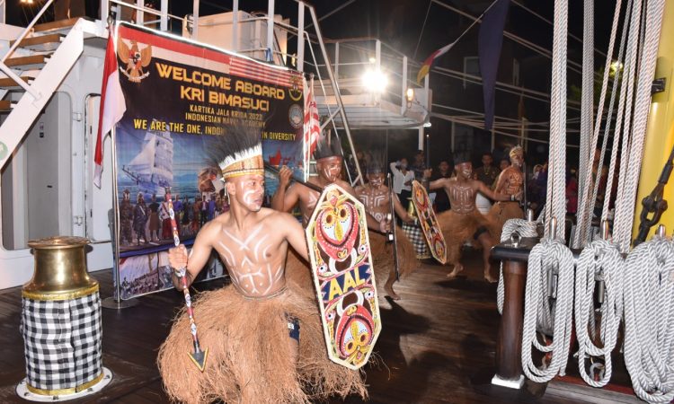 Kegiatan cocktail party digeladak KRI Bima Suci-945 sangat meriah dan para tamu undangan terbius dengan penampilan kegiatan seni budaya yang ditampilkan oleh para Taruna/Taruni Akademi Angkatan Laut Angkatan 69. (Pen Lanal Denpasar)