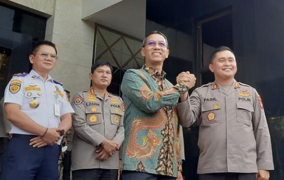 Jakarta – Penjabat Gubernur DKI Jakarta Heru Budi Hartono disambut hangat jajaran Kapolda Metro Jaya Irjen Fadil Imran dan Wakapolda Metro Jaya Brigjen Hendro Pandowo.
