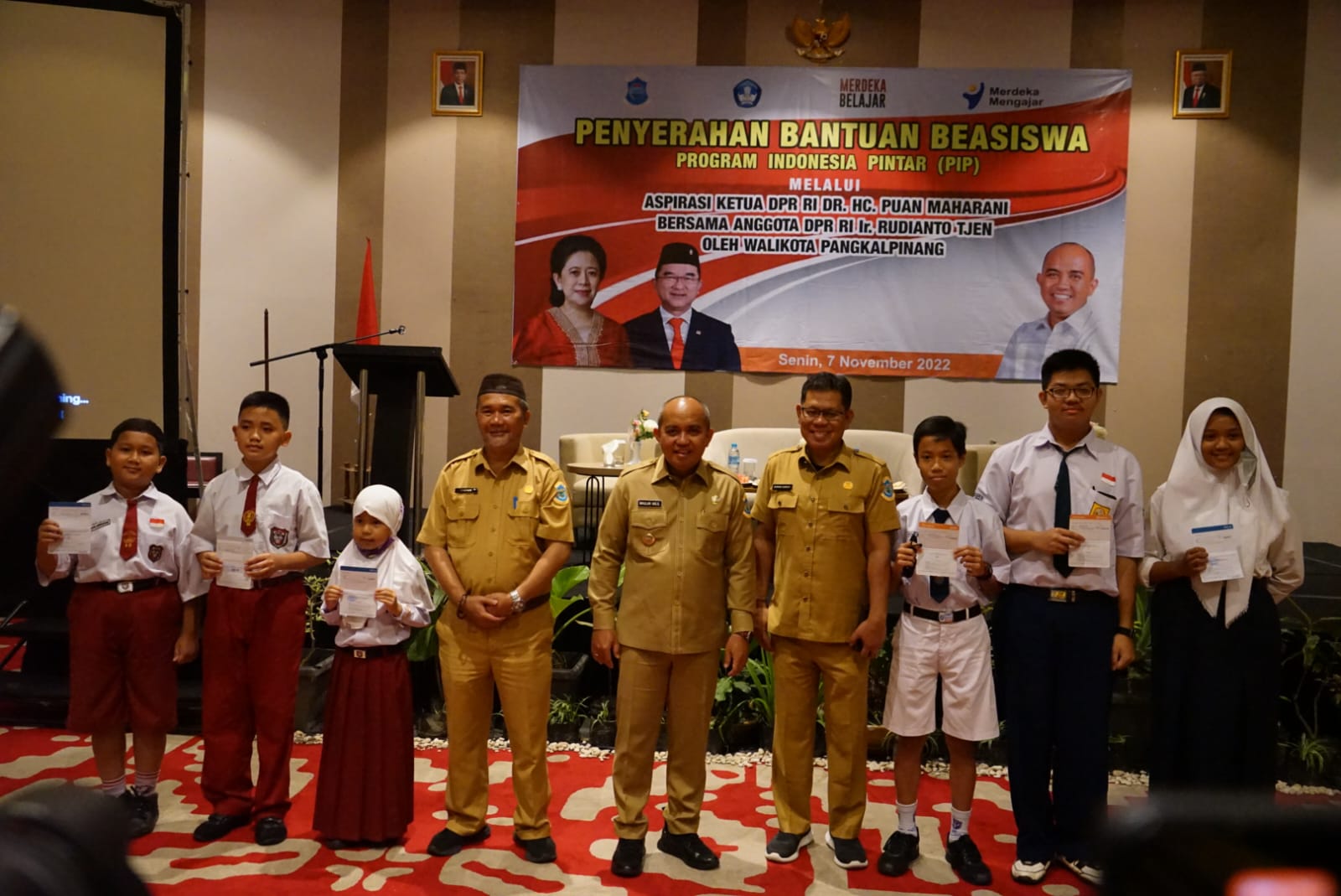 PANGKALPINANG – Pemerintah Kota (Pemkot) Pangkalpinang serahkan bantuan beasiswa Program Indonesia Pintar melalui aspirasi Ketua DPR RI, Dr.(HC) Puan Maharani bersama Anggota DPR RI Fraksi PDI-Perjuangan Rudianto Tjen, Senin (7/11/2022) di Hotel Fox Harris Kota Pangkalpinang.