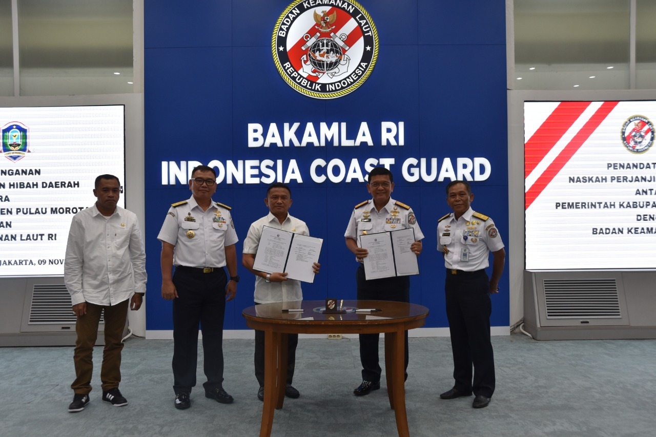 Penandatanganan dilakukan oleh Kepala Zona Bakamla Timur Laksma Bakamla Dr.Drs. Haris Djoko Nugroho,M.Si dan Pemkab Pulau Morotai Pj. Bupati Muhammad Umar Ali, SE., yang berlangsung di Aula 2 Mabes Bakamla RI, Kamis (10/11/2022).