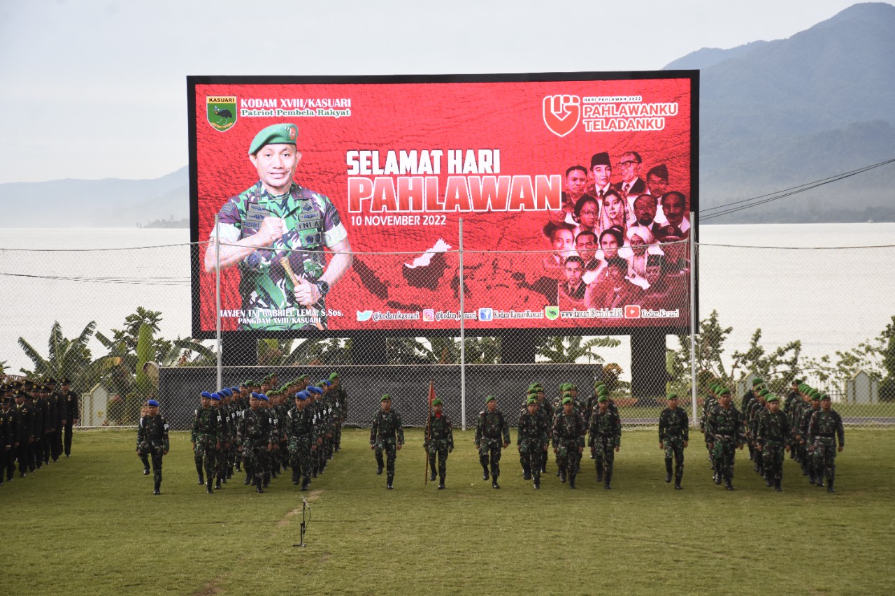 Manokwari – Untuk mengenang dan menghormati jasa serta perjuangan para Pahlawan dalam mempertahankan kemerdekaan Indonesia, Kodam XVIII/Kasuari beserta seluruh jajaran, menggelar Upacara memperingati pertempuran 10 November 1945 di Surabaya yang kemudian dikenal dengan Hari Pahlawan, di Lapangan Upacara Makodam, Trikora, Arfai 1, Manokwari, Papua Barat, Kamis (10/11/2022).