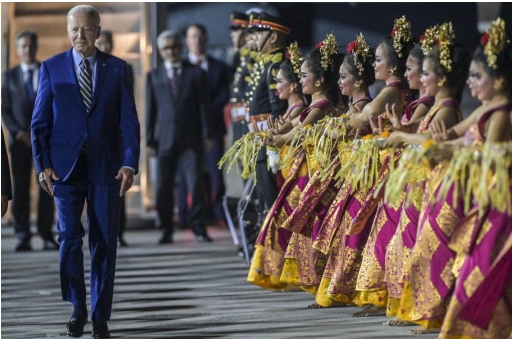 Kedatangan Biden disambut dengan pasukan jajar kehormatan dan penampilan puluhan penari Bali. Dan Joe Biden tampak senang dan tersenyum melihat sambutan para penari Bali tersebut.