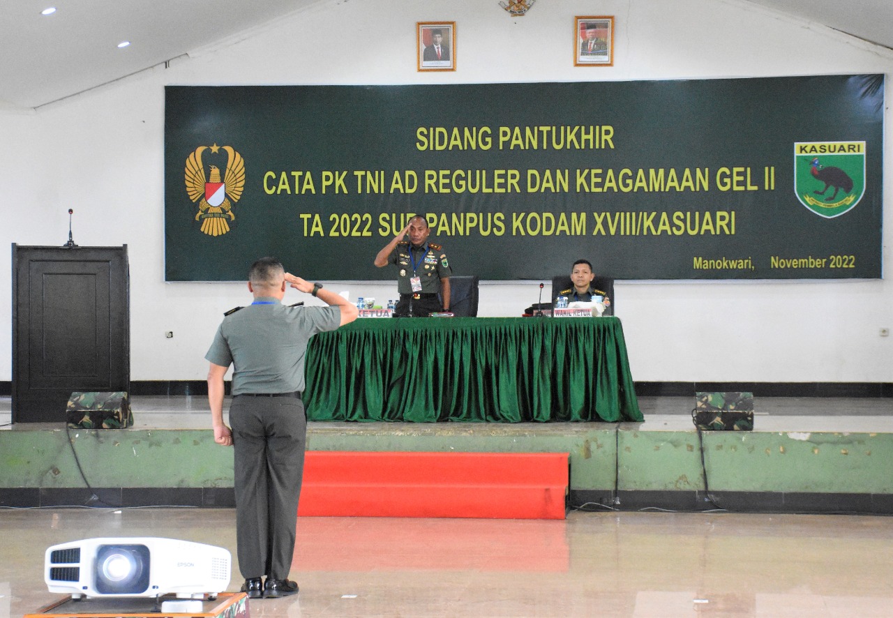 Manokwari – Pangdam XVIII/Kasuari, Mayjen TNI Gabriel Lema, S.Sos., memimpin langsung jalannya acara sidang Pantukhir Cata PK TNI AD Reguler dan Keagamaan Serta Otsus Sub Panpus Kodam XVIII/Kasuari TA. 2022, di aula Makodam, Trikora, Arfai 1, Manokwari, Papua Barat, Sabtu (19/11/2022).