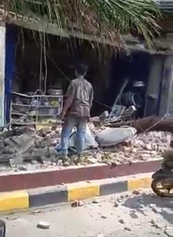 Bangunan lain di sekitarnya juga rusak. Salah satunya toko grosir di seberang Makodim. Sebagian atap dan tembok bangunan toko grosir rubuh.