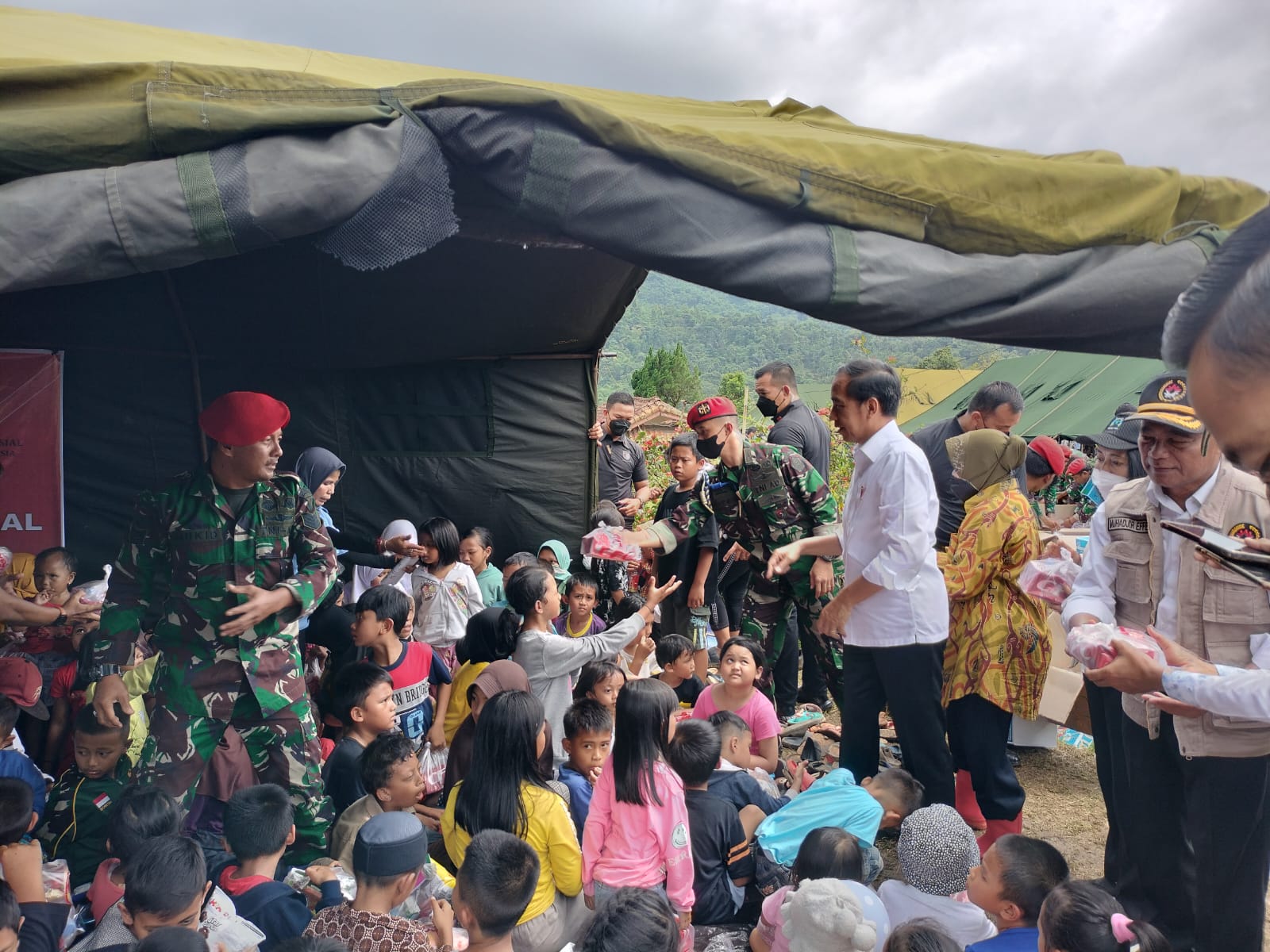 Setibanya ditenda pengungsian Kopassus, Presiden Jokowi langsung berinteraksi berdialog dengan warga dengan mengunjungi tiap tiap tenda, ada enam tenda besar di Posko Kopassus. Kepada warga Presiden menerangkan bahwa pemerintah memberikan sumbangan kepada masing masing Kepala Keluarga sebesar 50 juta rupiah untuk membangun kembali rumah mereka yang hancur karena gembabumi beberapa hari lalu.