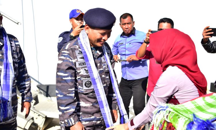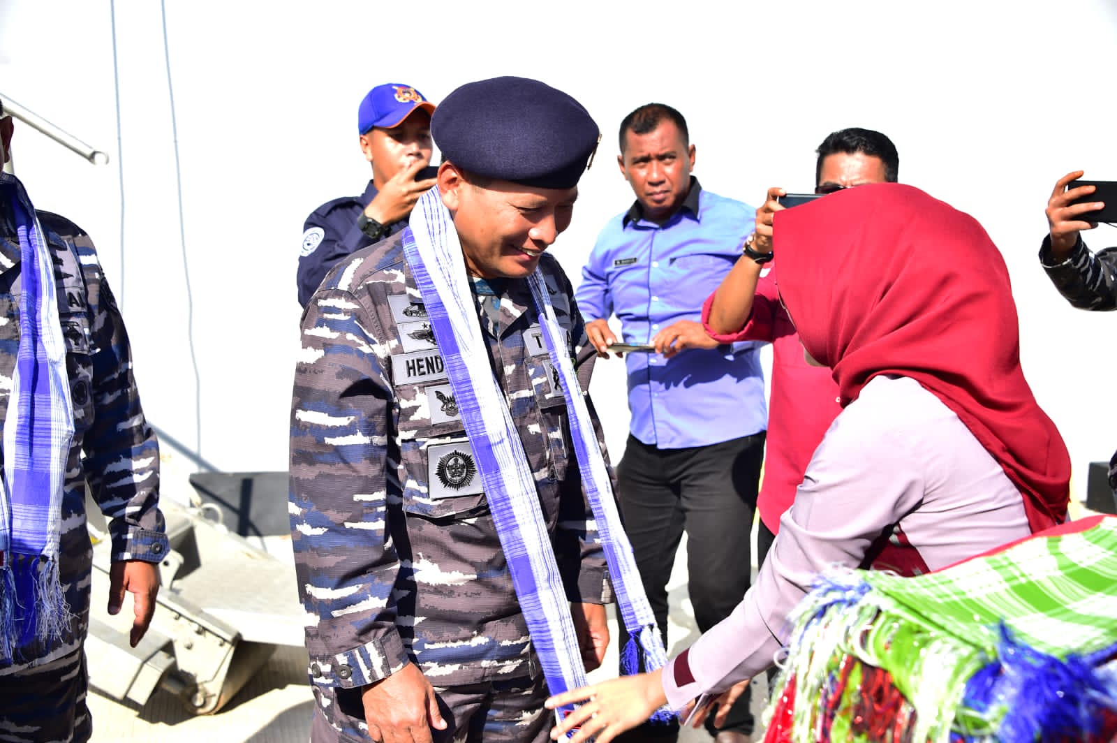 Tiba di Dermaga Pelabuhan Pelni Pangugulubelo, Satgas Hari Nusantara disambut dengan pengalungan Shale kepada Wadan Satgas Kolonel Laut (P) Joko Setiyono S.E., M.Tr. Hanla., CRMP.
