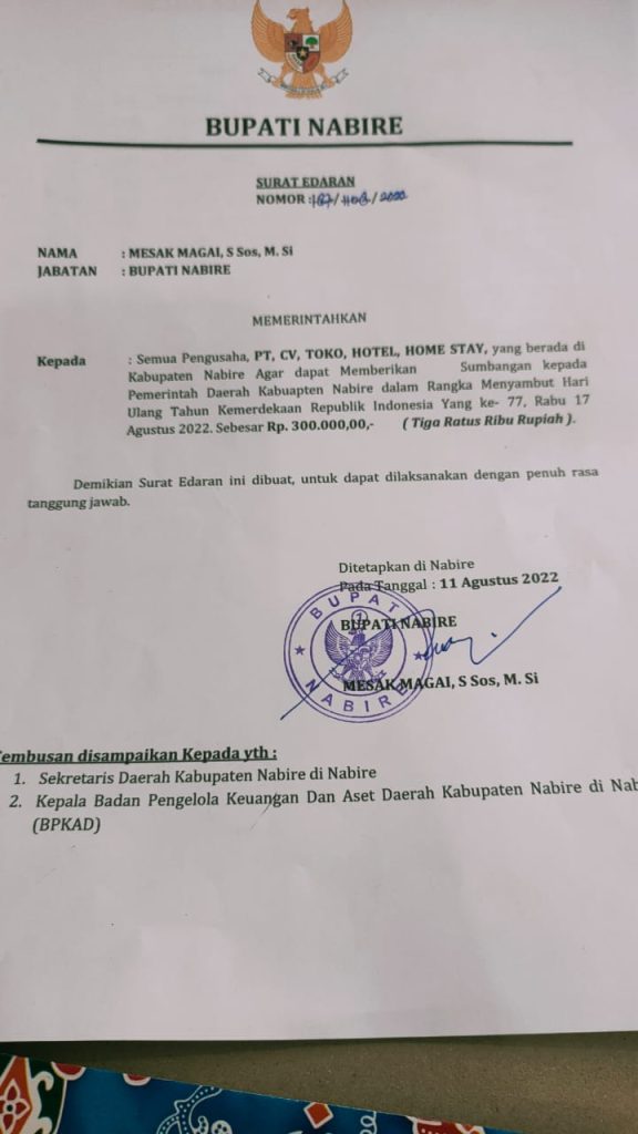 - Surat edaran Bupati Nabire Nomor : 187/ 1108/ 2022, Yang ditetapkan dinabire pada tanggal 11 Agustus 2022 dan ditanda tangani oleh Bupati Nabire MESAK MAGAI, S.Sos. M.Si yang isi didalam surat yaitu untuk meminta sumbangan kepada pengusaha di Kabupaten Nabire dalam rangka menyambut Hut RI Ke-77 sebesar Rp. 300.000.