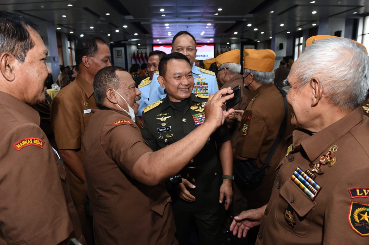 Tanpa canggung, orang nomor satu di TNI AD ini menyapa dan menyalami, berfoto, serta berdiskusi dan dalam kesempatannya Kasad juga menyumbangkan suara emasnya dengan melantunkan lagu Banyu Langit yang disambut penuh keceriaan oleh para veteran dan undangan yang hadir dalam acara tersebut.